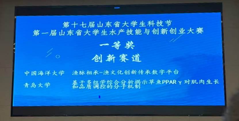 我院黄文婷同学带队的 “基于多组学综合分析揭示草鱼PPARγ对肌肉生长和品质调控的分子机制”项目在创新赛道中脱颖而出,荣获一等奖。任鑫璐团队开展的“海藻渣水解液功能性饲料添加剂的开发及其在水产健康养殖中的应用”荣获二等奖;龙采薇团队“半滑舌鳎响应鳗弧菌感染的基因可变剪接分析与结合珠蛋白不同亚型功能研究”和吕浩民团队“半滑舌鳎对碱胁迫的生理响应机制探究”两个项目获得三等奖。这些创新性研究聚焦海洋渔业关键技术难题,深入解析半滑舌鳎等经济鱼类的抗病抗逆分子机制,创新开发绿色高效的健康养殖模式,其科研成果为提升水产养殖经济效益与生态效益提供了重要的理论依据和技术支撑。