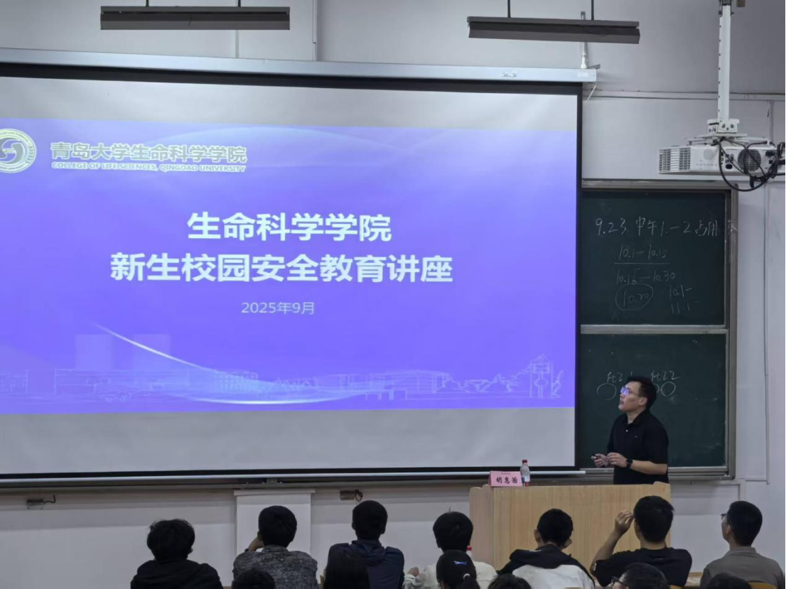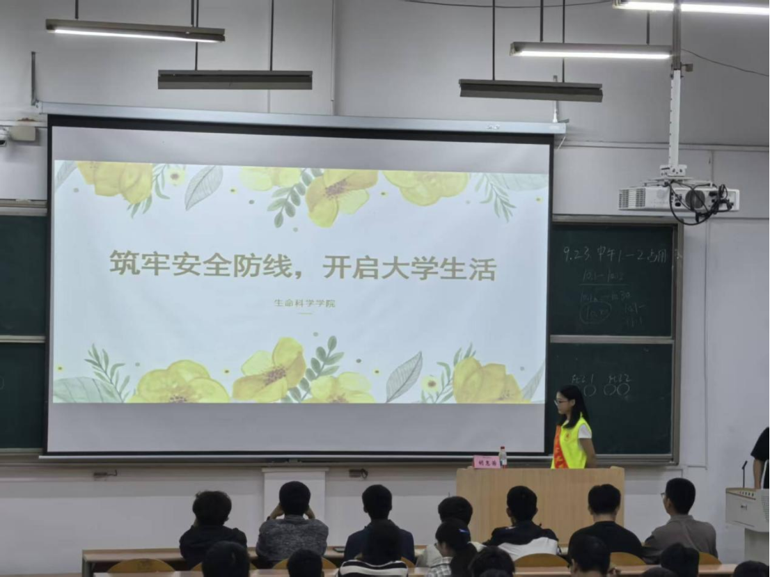 警钟长鸣,平安相伴。为强化本科新生安全防范意识,扎实推进校园安全教育落地见效,营造安心的学习生活环境,2025年9月23日,生命科学学院于金家岭校区西院一教111教室开展2025级本科新生校园安全教育讲座。2025级本科生辅导员马国成,校安防宣讲团团长胡惠茜,2025级全体本科新生参与本次讲座。