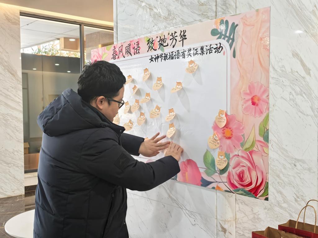 与此同时,为向全体女教职工致以诚挚敬意与美好祝福,营造尊重、关爱、温暖的工作氛围,学院在大厅面向男教职工开展春风暖语 致‘她’芳华”——女神节祝福语征集活动,男老师们围绕致敬、祝福、赞美,为女教职工写下真挚暖心的节日寄语。