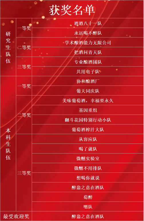 经过一系列的比拼,本次大赛的最终获奖情况正式揭晓。获奖队伍凭借创新的酿造工艺、协调饱满的酒体风味,获得了评委们的一致认可,同时在观众投票环节中人气最高的队伍,也成功摘得“最受欢迎奖”。本次大赛的一、二、三等奖奖品均由生命科学学院与华东百利酒庄联合赞助提供。