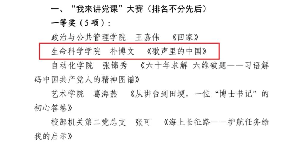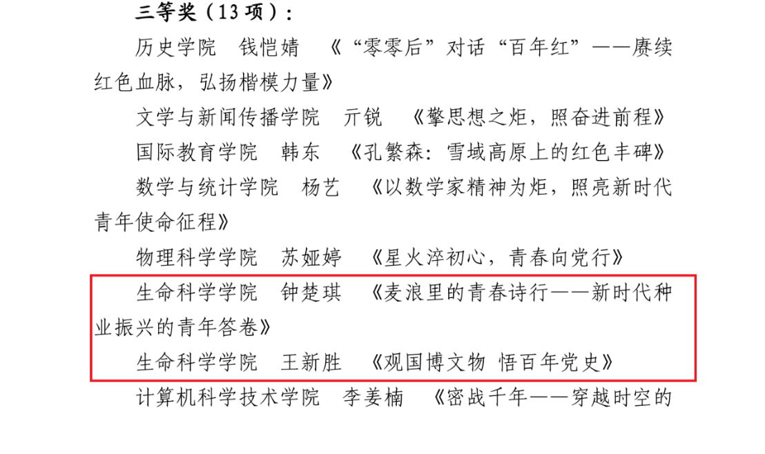 喜报传来,在青岛大学第七届“我来讲党课”大赛中,我院参赛师生脱颖而出。生命科学学院朴博文老师荣获一等奖,生命科学学院王新胜老师,钟楚琪同学分别荣获三等奖,充分展现了学院党建引领与思政教育方面的扎实素养。